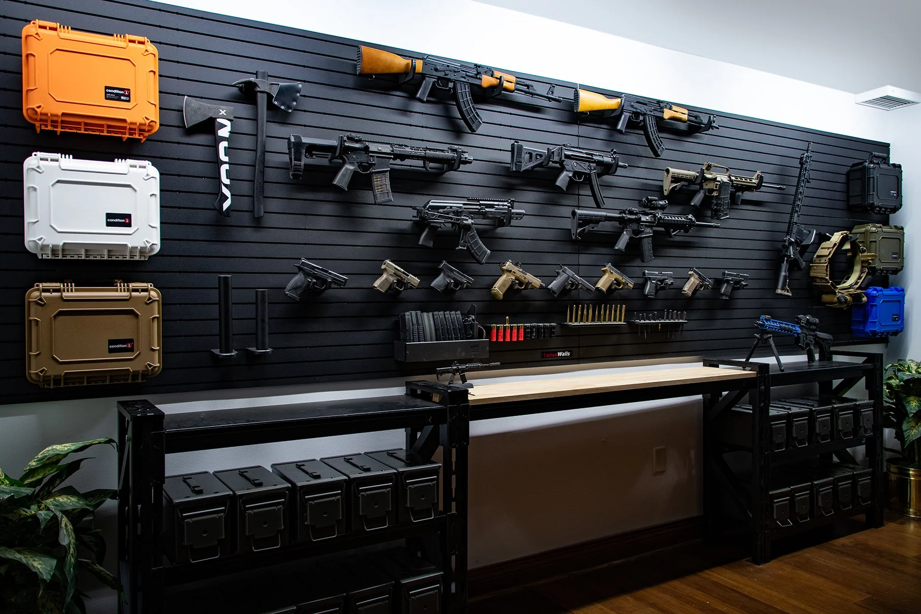 COMMAND YOUR SPACE THE SENTRY $499.00 THE PATRIOT $700.00 THE SENTINEL $899.00 THE COMMANDER from $1,100.00 THE PREPPER from $2,300.00 THE GENERAL from $3,500.00 60" WOODEN GUNSMITHING BENCH from $300.00 Vertical Assembly from $80.00 Crossbars from $80.00 Flat Shelves from $100.00 Extra Ammo Can Trays $10.00 Gift Card from $100.00
